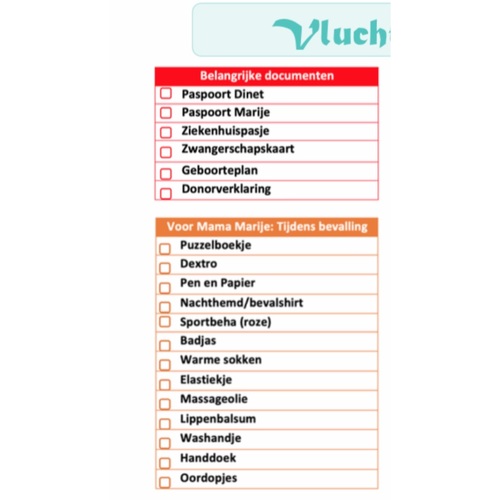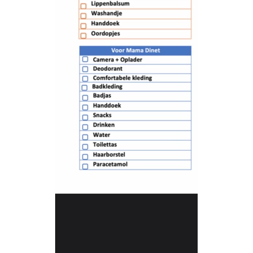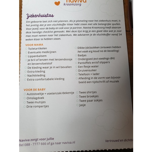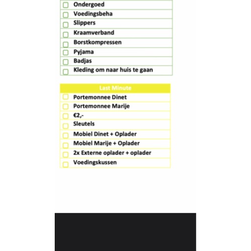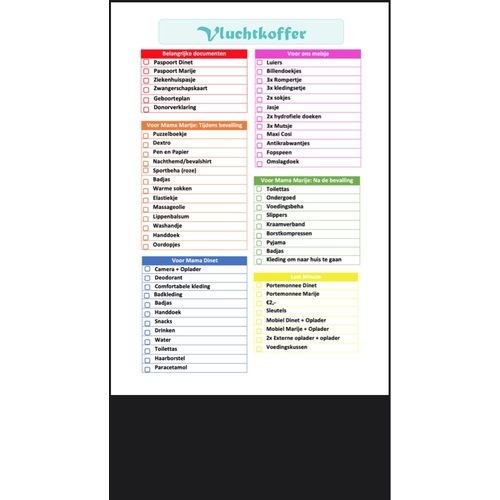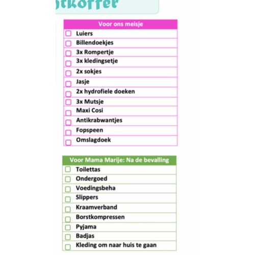 Ik heb zelf een lijst gemaakt met wat ik allemaal (eventueel) nodig heb. Het zal zeker veel te veel zijn en zal de helft waarschijnlijk niet nodig hebben, maar vind het een prettig idee om het mee te hebben 😌