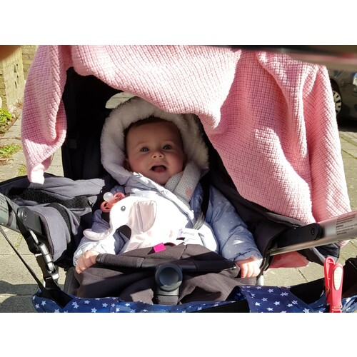 Wij hadden ook een een parasol maar dat is alleen handig als je wagen stilstaat. Wil je wandelen dan is een doek met knijpers handiger aangezien de zon steeds van de andere kant komt 🤓
