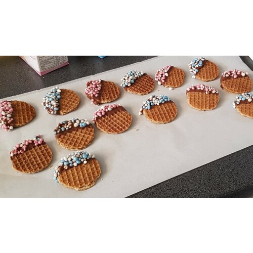 Wij weten nog niet wat het wordt, vandaar de roze 茅n blauwe muisjes ;) verpakt in folie en dan met collega in hun postvak