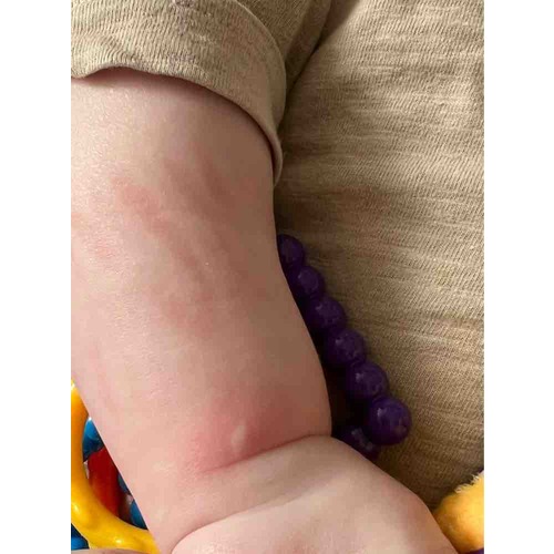 Onze zoon heeft voor de 2e keer dit plekje op zijn pols (op dezelfde plek). Beide keren zagen we het toen hij wakker werd. Hij slaapt in alle slaapzakken met zijn armen en handen volledig bedekt. De strepen erboven op de foto is een afdruk van de rand van de sok die over de mouw zat.