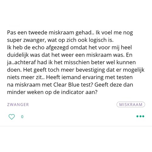 Oke, ik was 7 weken toen ik de miskraam kreeg. Ik dacht misschien als de indicator bij 1-2 aangeeft dan weet ik zeker dat het niet zo is dat er 'toevallig' misschien nog een vruchtje zou zitten.. Want dan zou hij 3+ aan moeten geven omdat na miskraam hcg natuurlijk wel sterk daalt. Geen digitale test geeft idd natuurlijk nog positief aan. Ik heb geen echo laten maken, zie berichtje met screenshot.. En dan ga je natuurlijk heel dom zitten denken.. Stél dat het er nu 2 geweest zijn dan zou t mogelijk zijn dat... Maar ja dat is mezelf ook hoop geven op niks natuurlijk;-)