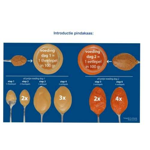 Ik heb de pindakaas en heel klein beetje tussen de 1e lepel fruithapje gedaan zodat het niet zo plakt. Het ei heb ik een heel klein stukje bij haar in de mond gedaan. Ze vond het maar wat raar, maar daarna wilde ze meer.