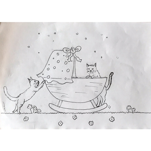 Wij hebben maandag onze kaartjes ontworpen. Het zijn er 4 die met een touwtje aan elkaar geknoopt worden. Niet iedereen krijgt dezelfde ivm meertaligheid en wel/niet uitnodigen voor kraamfeest. Het zwart is in werkelijkheid groen...
