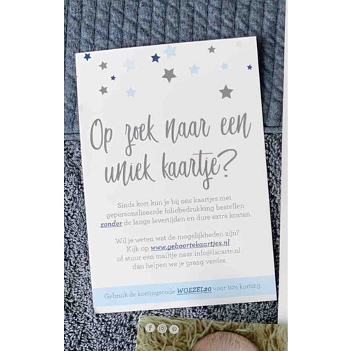 Wij zijn de geboortekaartjes aan het bestellen. Na eindelijk het ontwerp af te hebben en klaar zijn om te bestellen zijn we wel geschrokken van de prijs... vandaar dat ik hoop dat er iemand is met een kortingscode 馃槈 thanks!!