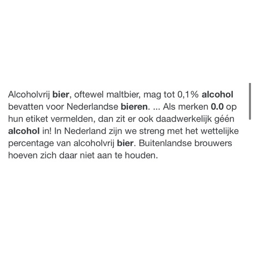 Ja maar ik heb dus gelezen dat 0.0 niet echt 0.0 is maar er dus nog een heel klein percentage alcohol inzit vandaar de vraag 😉