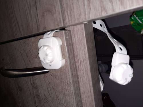 Wij hebben een tijdje een grote hydrofiele doek door een aantal handvatten gehaald en vastgezet met een elastiek. Hierdoor kunnen ze niet open. Was wel een tijdje een gepruts om de doek weg te halen als je iets nodig had maar op het laatst zat de doek gewoon losjes.. ze wist dat ze er niet meer bij kon dus was het niet meer interessant. Nu kijkt ze er helemaal niet meer naar om en is de doek gewoon weg. Hebben een vrij nieuwe keuken dus vond boren o.i.d. ook zonde. Beveiliging aan de binnenkant bleef niet echt plakken.