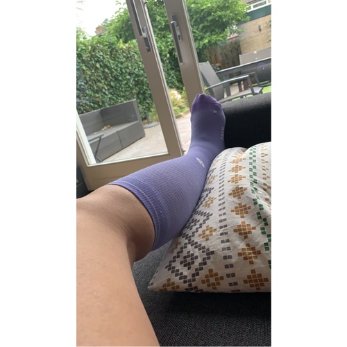 Ik had er niet zo veel zin in omdat de dikke vochtstukken op mijn voet beurs aanvoelden en het me heel naar leek om daar druk op te hebben, maar er is geen gevoeligheid als ik de sokken aan heb. Daarbij passen mijn schoenen weer (halleluja) en zijn mijn voeten aan het eind van de dag beduidend slanker.
