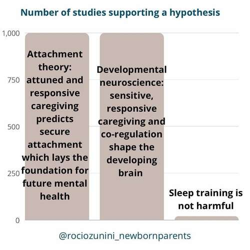 Sorry hoor, dit plaatje kan ik helemaal niks mee. Wat valt er onder “sleep training”? En geen enkele wetenschappelijke studie is zo zwart-wit als dit suggereert. Je kunt prima een “attuned en responsive” ouder zijn en je kind toch ook soms even 10 minuten laten huilen. Al is het alleen al omdat soms je andere kind(eren) ook wat hebben 🤷♀️ Het idee dat je slecht zou zorgen voor je kindje als je het niet bij ieder piepje doodknuffelt vind ik zoooo toxisch. En bij mijn dochter werkte het dus absoluut averechts, ook vanaf zeer jonge leeftijd al.