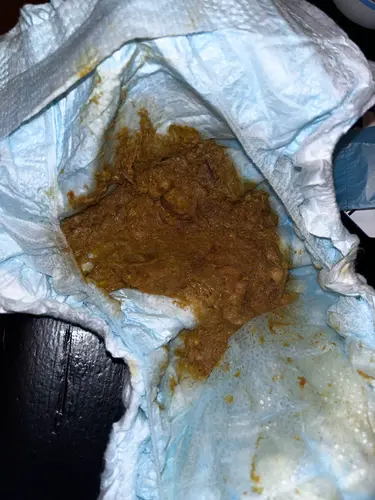 Krijg de kleur niet heel goed op de foto.. maar zitten ook vaak witte stukjes in alsof die een zetpil heeft gehad..
