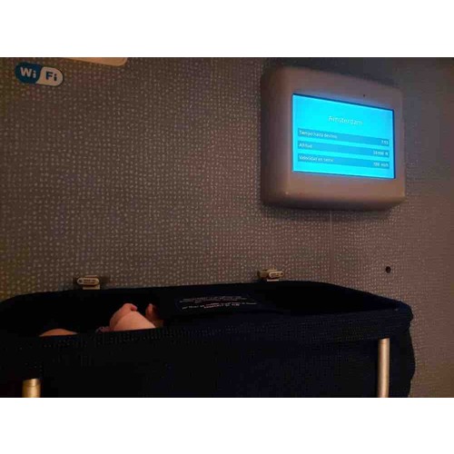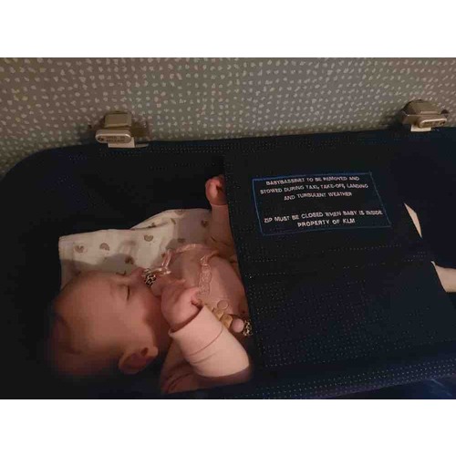 Een soort wiegje, die hangen ze aan zo’n tussenschot bij KLM. Misschien alleen voor vluchten buiten Europa, maar check het even met je vliegtuigmaatschappij. Moet je wel van te voren boeken!