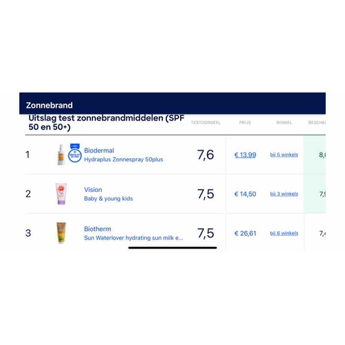 Die van de etos kids 50+ was vorig haar beste uit de test, niet duur en handig als spray. In de test van dit jaar blijkt dat er een stof in zit die door nieuwe onderzoeken puntaftrek krijgt bij de test. (Ik had het al gekocht 😂)