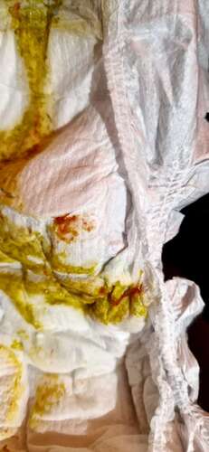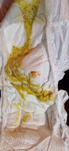 Het zit ook wel beetje achterin in de luier tussen de ontlasting. Is wat moeilijk op de foto te zien, maar wie weet is het wel plas. Ik zou het niet zeker weten. Weet je dan wat het eventueel zou kunnen zijn?