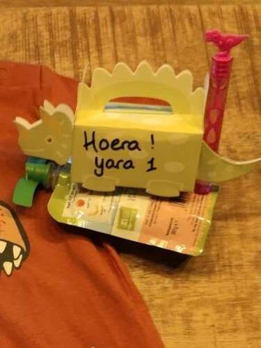 Het leukste cadeautje dat wij hebben gekregen vond ik een bootje voor in bad. Zelf hebben we geen cadeautje gedaan omdat ik dacht: iedere ouder heeft waarschijnlijk al zoveel zooi. We hebben een uitdeelzakje gemaakt met een mandarijntje, rozijntjes, een jungle feestmasker en een leuke foto erop van onze zoon.