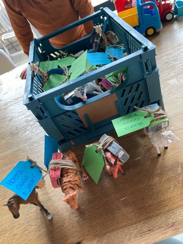 Ik heb zelf mini houten puzzels besteld op Temu. (Zag ze van de week ook bij de Lidl). Daarnaast trakteert hij op vers fruit (in de vorm van een pauw).