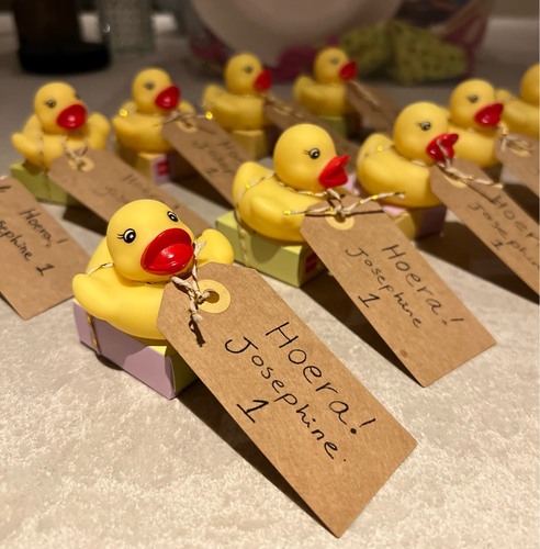 Op een groot dienblad met blauw crepepapier een zee gemaakt en daarin eendjes gedaan (er word er EENdje jarig)