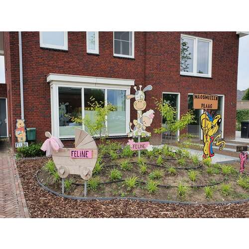 Wij hebben een weersbestendige spandoek in de stijl van ons geboortekaartje. We hadden dit ook bij onze dochter 2 jaar geleden en kunnen dit elke keer met haar verjaardag of met een speciaal feest zoals een kraamfeest of lentefeest terug bovenhalen. Vinden we wel leuk en is best goedkoop 🥳