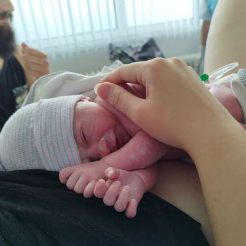 Zaterdag om 3uur 's nachts zijn de vliezen gebroken, maar de weeën zetten niet volledig door. Na een paar uur zat ik op 1 a 2 cm ontsluiting en het schoot verder niks meer op. We hebben het zondag aangekeken, maar ook zondag zette het meerdere keren na uren weeën toch niet door. Afgelopen nacht weer een paar keer dat het niet doorgezet heeft, dus toch maar de keuze gemaakt om vanochtend even een boost te krijgen dmv weeënopwekkers. Deze gaven mijn lichaam echt een boost, en snel kon ik het zelf verder! 11:15 zat ik op 3cm ontsluiting, 13:10 begonnen de persweeën en om 13:15 is Zion na 3x persen in bad geboren🥰
