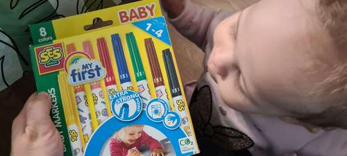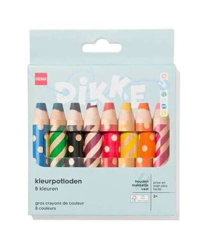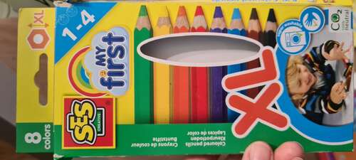 Ik gebruik de dikkere potloden maar ook de kleinere potloden dus niet de normale lengte. Deze zaten toevallig op een knutselmapje van Nijntje. Ook heeft ze waskrijtjes in die lengte. Ik doe het al sinds 11-12 maanden. Ze begreep het eerst natuurlijk niet maar nu inmiddels 2 maanden wel.