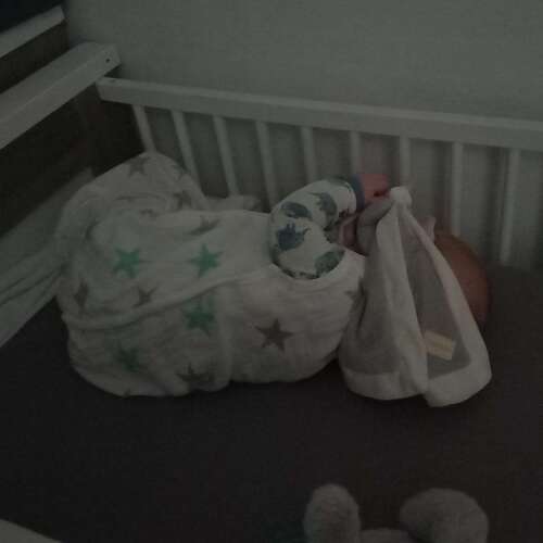Hier ligt hij mega fijn met een knuffeltjes te slapen en het is een enorme buikslaper. Op het begin heel eng, maar hij is sterk genoeg om het doekje weg te halen als het hem in de weg zou liggen en tilt ook z’n hoofdje goed op. Ons zoontje sliep met een knuffeltje vanaf 6 maanden (toen hij naar z’n eigen bedje ging).