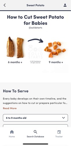 Ik raad je aan om de Solid Starts app te downloaden, daar kan je ongeveer al het eten invoeren en staan er plaatjes hoe je het beste kan snijden. Er staat dan onder het kopje ‘How to serve’ nog een tekst over hoe je het kan uitleggen. Het moet ongeveer zo groot zijn als twee vingers naast elkaar.