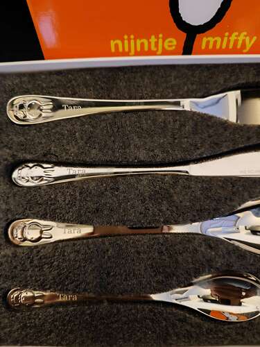 Voor onze dochter hebben we ook een Nijntje bestekken met haar naam en een hartje. Voor zoon nog niets 馃檲