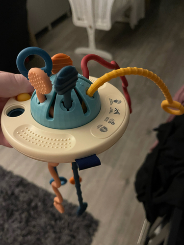 De rammelaar van Little Dutch (Sailors Bay) en de Mushi stapeltoren. En hij vindt sensorische balletjes ook fijn. En ineens alles waar een waslabeltje aan zit.