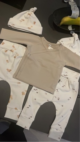 Als geboortepakje hadden we 2 setjes, 1 voor meisje, 1 voor jongen, beiden incl een muts met de naam bij dat geslacht.