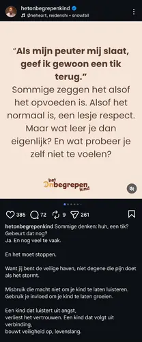 Maar zoals ik het lees is het volgens mij eerder een meningsverschil in opvoedingsstijl en dan ben ik ook fel tegen een corrigerende tik. Er zijn zoveel pedagogische onderzoeken gedaan die uitwijzen dat het enkel averechts werkt.
