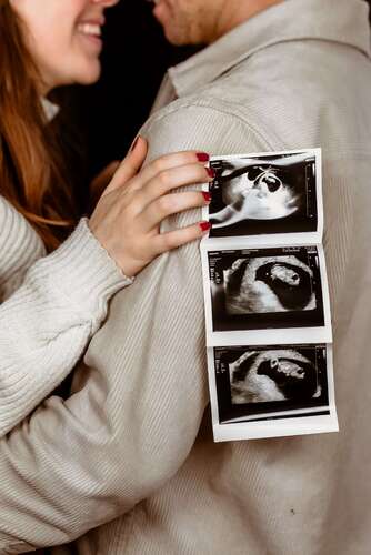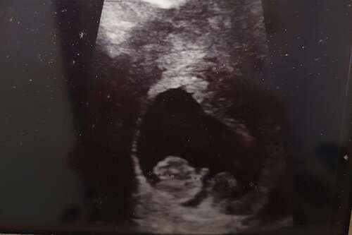 Ik was al verder dan gedacht en met 9+4 te laat voor de theorie, maar je ziet hier wel 2 lichte plekken en in het echt is het nog een stuk duidelijker verschil. Die langrekte witte streep links/onder bij de baby is waar je dan op hoort te letten. (Dit was bij mij uitwendig. En als het dus optijd zou zijn was het een jongen volgens de theorie.)