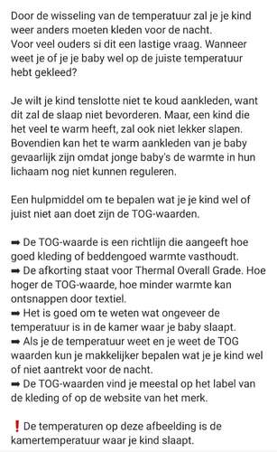 Als ik de voorgeschreven tog waardes zou hanteren, heeft mijn zoontje het enorm koud. Al paar nachten dat hij paar keer wakker wordt en fris aanvoelt. Ik vond het eng om er ruim boven te zitten, maar nu slaapt hij goed en voelt sochtends ook nog goed aan. Moet wel zeggen dat ik alleen zijn nekje voel en niet doe temperaturen. Bij ons is het zo'n 16-17 graden en hij draagt romper, pyjama, winterslaapzak met mouwen, laken en deken.