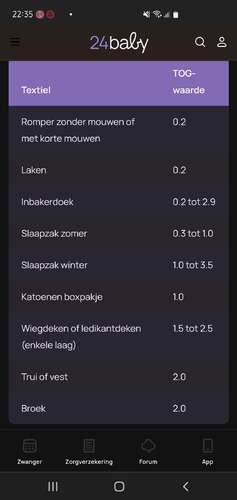 Wij hebben een inbakerslaapzak van love to Dream 0.5 TOG een romper langemouwen pyjama sokken. En lagen een winterdeken en zomerdeken. En als ik de gevoet heb om 2.30 dan gaat er meestal nog deken dekentje. Bij omdat ze dan fris zat voelt als ik de er uit haal. Nou is het bij ons op de kamer 13/14 graden. En op haar eigen lamers is het zelfs 12 dus ze slaapt nog bij ons.. en ju moet het nog echt koud gaat worden 😵💫