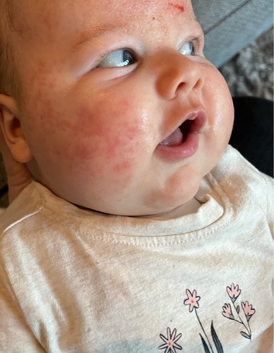 Is het alleen op het gezicht? Dit lijkt namelijk een beetje op baby acne en daar moet je vooral niet te veel op smeren, dat gaat vanzelf weg..