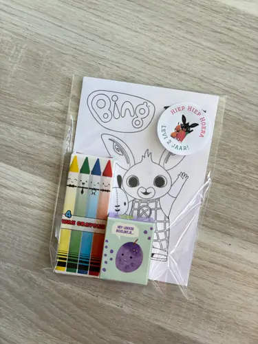 Je hebt zo’n website ikgatrakteren.nl nou echt superleuke dingen en je kan je pakketje helemaal zelf samen stellen! Ons zoontje had een Bing kleurplaat met krijtjes en rozijntjes.