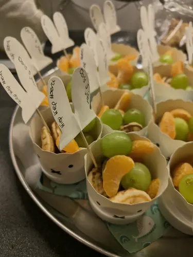 Je hebt bij de Hema van die leuke muffin vormpjes van nijntje. Toen mijn dochter 3 werd hebben we ze gevuld met poffertjes en fruit, groot succes. Mijn zoontje werd 3 weken ervoor 1 jaar en hij heeft ook de bakjes getrakteerd maar dan gevuld met mini rijstwafels en fruit.