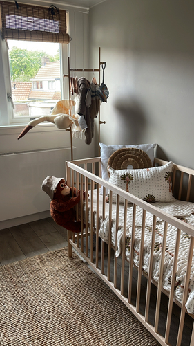 Ik hou van strakke kinderkamers dus zelf hang en zet ik niet teveel neer. Wandkleed, vlaggenlijn en leuk printje beddengoed en heb een leuk nachtlampje op lijstje gezet..