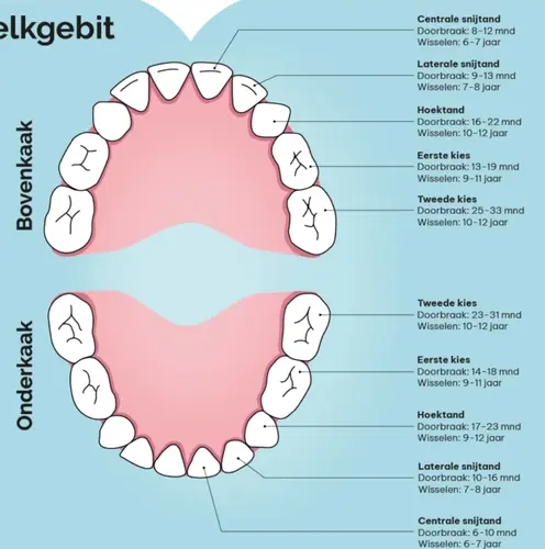 Mijn zoontje heeft zijn onderste voortanden, 1 hoektand boven en 1 voortand boven. Zijn andere voortand en hoektand komen er nu aan. Denk zelf dat het geen kwaad kan hoor 😊