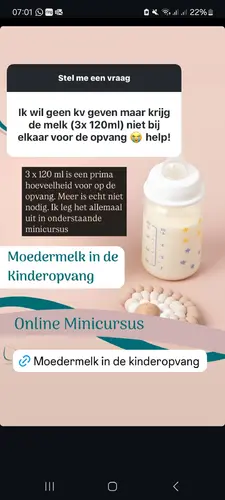 Over niet voldoende kolven: ik had hetzelfde probleem. Met bijkolven ‘s avonds en ik het weekend, kolfde ik genoeg. Daar was ik op een gegeven moment helemaal klaar mee. Nu krijgt mijn zoontje op het kinderdagverblijf wat ik gekolfd heb ivm een fles kunstvoeding. Scheelt mij heel veel stress.