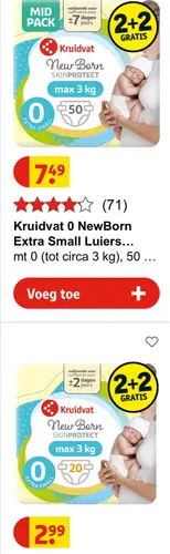 Allereerst gefeliciteerd met jullie kleine meisje! Oh wat gek, heeft hij ook aan een van de medewerkers gevraagd of er niet toevallig nog wat achter lag? Hier in de Kruidvat nog heel veel maat 0 (toevallig net gekocht omdat wij komende dagen ook weer een kleintje verwachten). Ze zijn nu 2+2 gratis zelfs. Onze eerste heeft wel 2 maanden in maat 0 gezeten ook al was ze te laat geboren. Ze was exact 500 gram zwaarder dan jullie kindje (2710 gram en 44 cm). Dus ik denk dat je best wel wat kan inslaan. Als de pakken dicht blijven mag je ze ruilen voor een grotere maat mocht dat t.z.t. nodig zijn. Je zou ook Kruidvat Pure & Soft maat 1 kunnen kopen (2-5 kg) hebben wij ook wel eens gedaan. Maar maat 0 van de normale Kruidvat luier is tot 3 kg dus zal beter aansluiten.