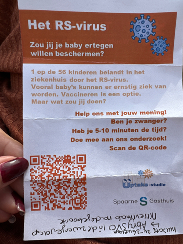 Hey, op de negenmaandenbeurs, heb ik een foldertje gehad over het RS virus. Het is een andere prik dan de 22 weken prik. Het is nog niet opgenomen in het rijksvaccinatie programma , daar deden ze dus een onderzoek naar of mensen dat zouden doen of hoe belangrijk je het vindt. Hier een fotootje van de folder. Ik weet alleen niet of het hier mag, want er wordt dus ook tijd voor een onderzoek gevraagd. De mevrouw van de stand vertelde me dat je tijdens de zwangerschap bij 24-36 weken kon laten inenten die bij de huisarts aangevraagd kan worden. Het heet Abrysvo in de zwangerschap en Nirdevimab ná de geboorte. Ter info!