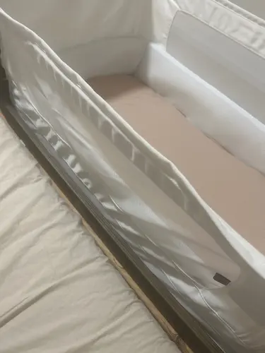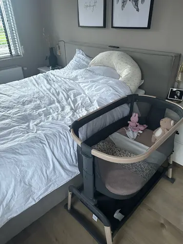 Hij staat, duurde even wat langer haha maar bij ons zit er geen gat tussen, komt bij jullie het wiegje tegen je bedframe? Wij hebben een best laag frame, misschien komt het daardoor? Ik heb wel dat het matrasje bol trekt door de matrasbeschermer + molton + hoeslaken.. heb jij dat ook?