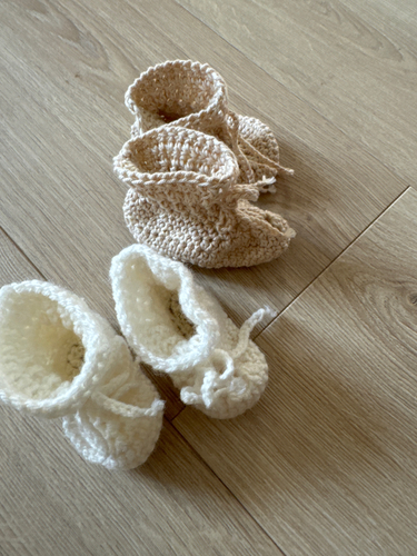 Deze cutie slofjes gehaakt door m’n schoonmoeder, maar ik kan wel haken dus ...