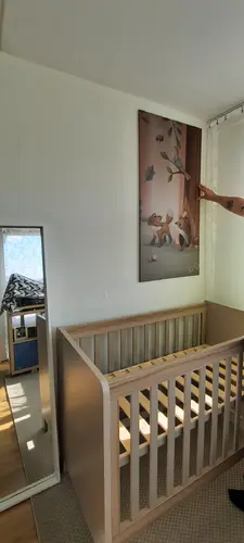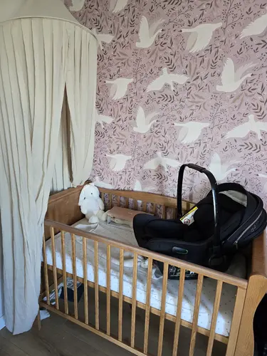 Wij hebben dit behang in de babykamer, was er direct verliefd op! Meubels hebben een lichtbruine kleur, behalve de schommelstoel, die kopen we met een kussen in geel of groene kleur. We houden allebei van kleur dus vandaar de keuze voor dit behang en de schommelstoel :)