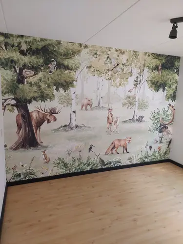 En in ons vorige huis had onze zoon de kleur Sali groen van flexa op de muren met dit foto behang