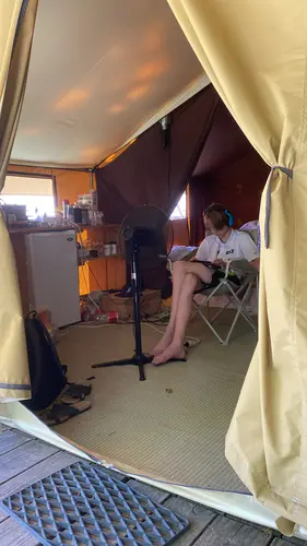 Wij zitten op een klein houten krukje, niet echt bevorderlijk voor de houding en bloedsomloop 😅.