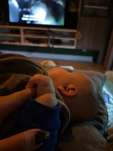De kleine ligt bij ons beneden tot wij naar boven gaan tussen 9 en 10. Daarvoor wil hij wel slapen, maar dan wel op ons! Kleine slokjes drinken af en toe en dan weer verder. Ik heb al vele avonden met 1 borst bloot op de bank gezeten en ons ventje er of aan of tegenaan😂