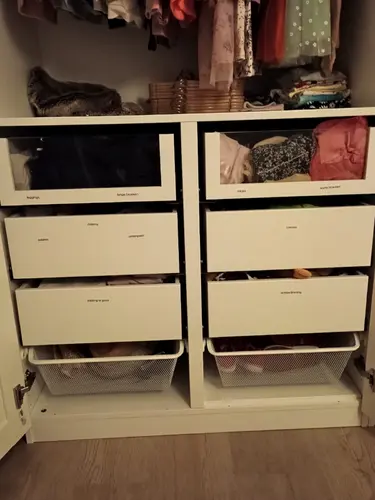 Ik ga m dalijk in elkaar zetten. Foto volgt haha. Heb gekozen voor een combinatie van manden, lades, deurtjes en laat 2 vakken open en ga daar een stang in maken om kleertjes op te hangen.