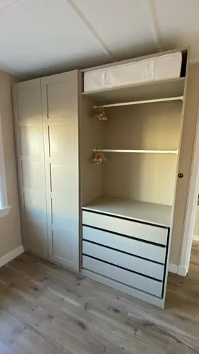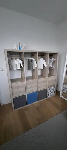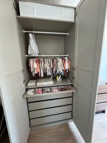 Wij hebben een Kallax kast van Ikea omgebouwd. We hebben een aantal planken eruit gehaald en daartussen een stang geplaatst. En een aantal lades toegevoegd.