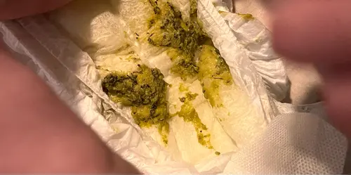 Ik trof dit in de luier van mijn dochter aan, dit heeft ze nog nooit eerder gehad… ik heb haar afgelopen dagen geen hapjes gegeven omdat ze niet fit was ze dronk gelukkig wel goed en gisteren ging het ook al stukken beter met haar, op haar verkoudheid na.