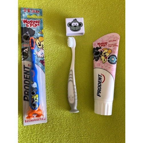 De Woezel en pip tandenborstel kreeg ik bij de Zwitsal spulletjes en de tandenborstel met dat aapje van de zorgverzekeraar (handig met zo’n ‘dopje’ erop) en de tandpasta van prodent van 0-6 jaar ..