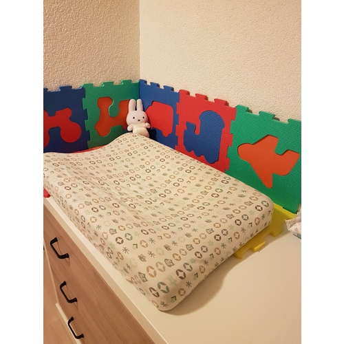 Wij hebben de gezellige speeltegels op de commode liggen en ook een rij omhoog gebouwd langs de muur... Dit blijft prima zitten en beschermd mooi